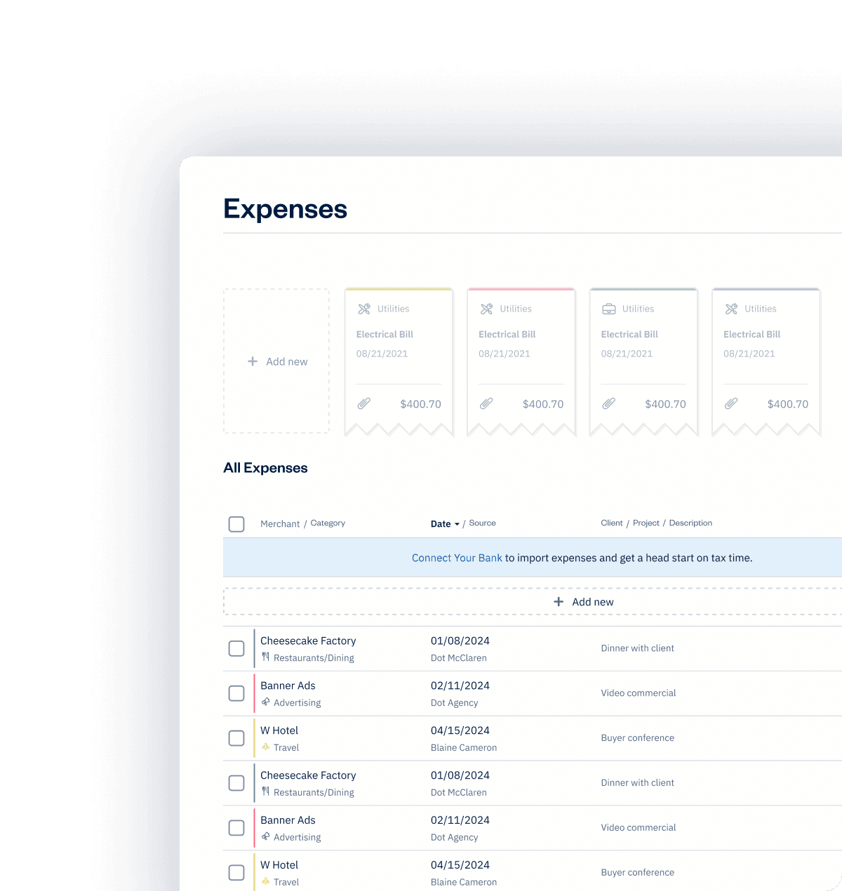 Connect your bank account or credit card to FreshBooks and say goodbye to manual entry. Every day your FreshBooks account will be updated with your most recent spending so your business is always automatically up-to-date