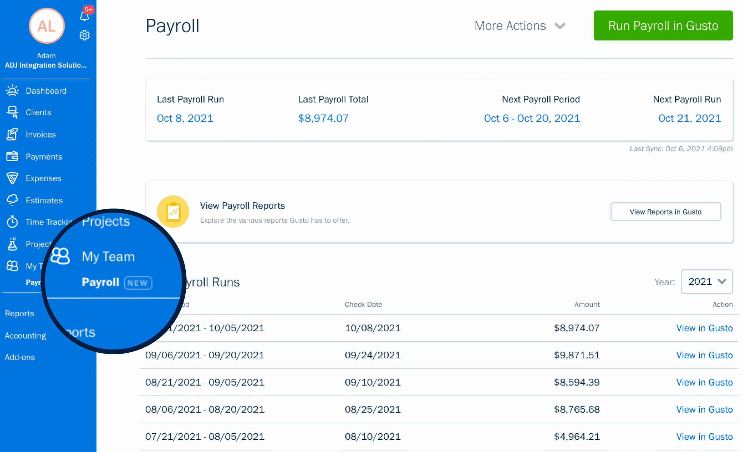 You’ll never again have to pull payroll reports and then create manual payroll entries inside of FreshBooks. Instead, processed payroll in Gusto will automatically be reflected in your client’s FreshBooks account.