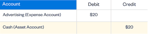 You pay $20 for a website domain for your business. When you pay for the domain, your advertising expense increases by $20, and your cash decreases by $20.