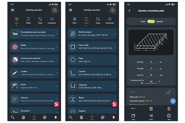 Construction Calculator is a free construction calculator app for Android that helps contractors calculate the quantity of project materials they'll need, including bricks, lumber, flooring, and paint. Alternatively, you can calculate concrete volume, armature weight, number of wall blocks needed, and more. It works offline, too, so it's especially helpful when you're on a remote construction site.