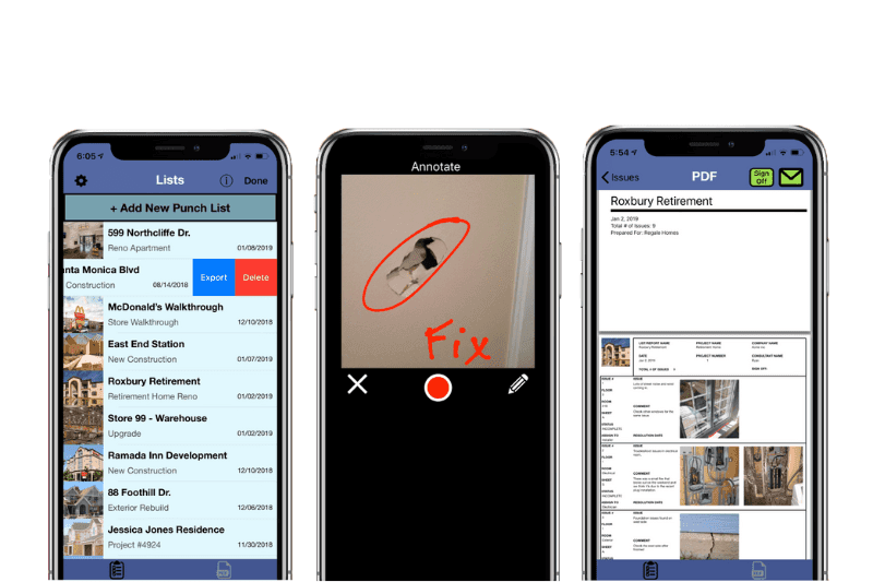 Easily list all the work that needs to be done, such as incorrect installations or damage to materials, finishes, or structures. Create reports, add photos and notes while in the field and annotate images too. In short, the app is the perfect tool to help you meet contract specifications so you can finish the job and get paid.