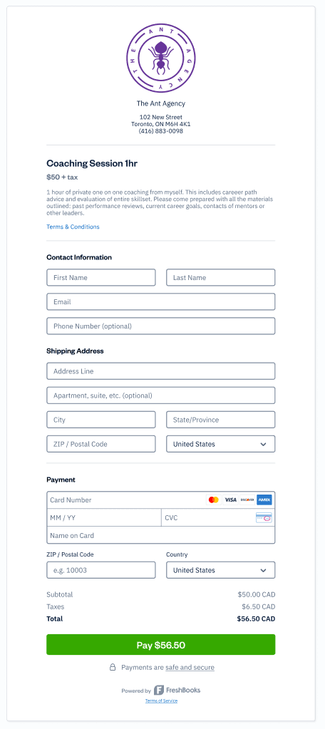 When a new client of yours pays by Checkout Link, they’ll automatically be added as a Client within your FreshBooks account. This makes it easier to track and manage every payment you receive, and means less time spent adding new client profiles every time you get paid. It’s a simple, barrier-free payment process that allows you to sell products and collect payments super fast.