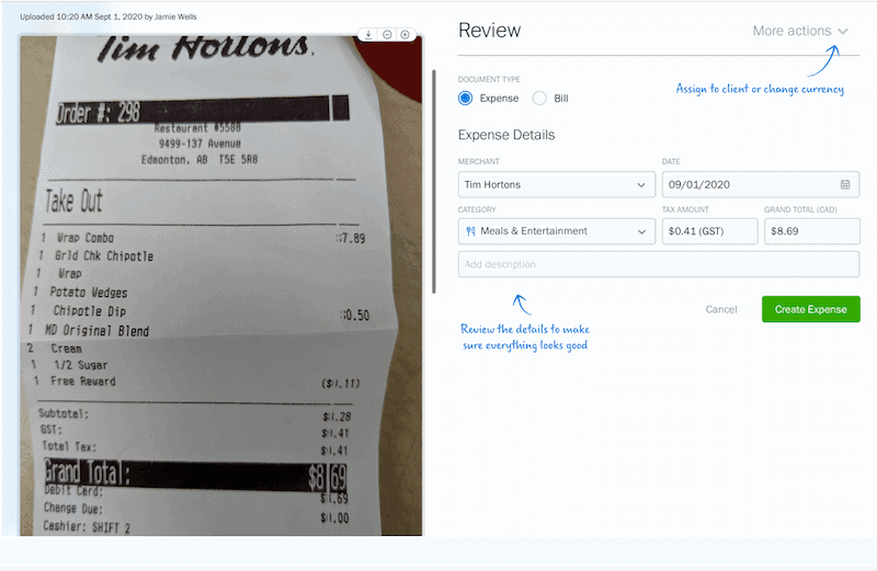 - Automatically entering the merchant, cost, tax info, and suggesting categories for you