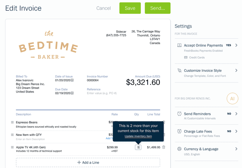So taking the dog trainer example, if there is a lot of customer demand for a tool you’re selling after a class, that’s also available online, you want to know in real time if that item is available. FreshBooks keeps that stock updated so you can track inventory across multiple locations.