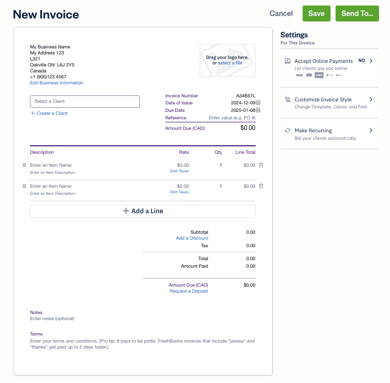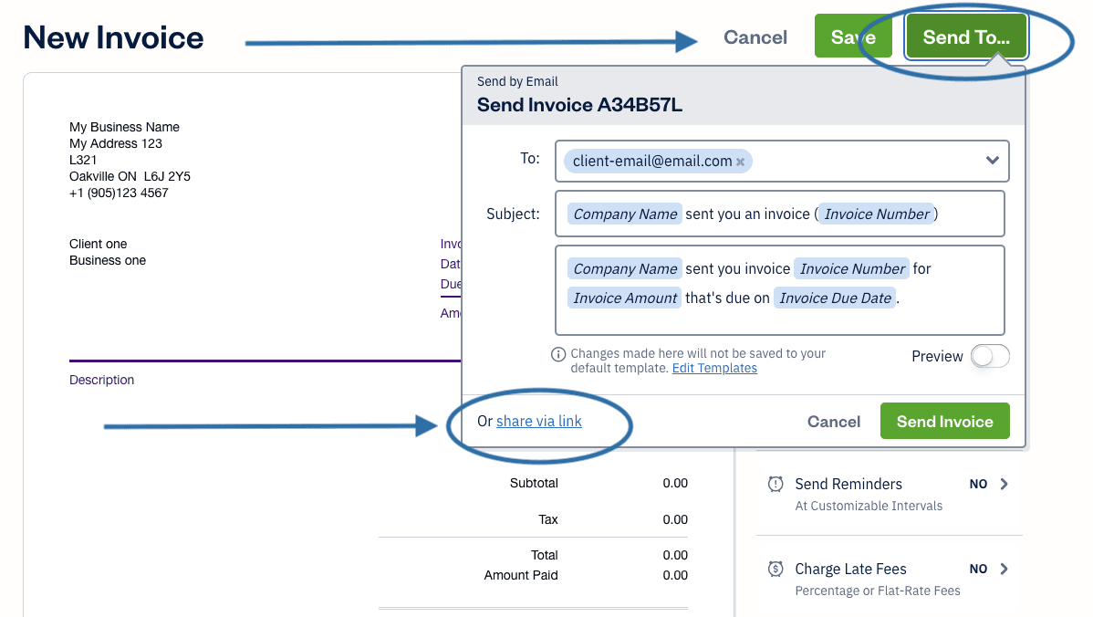 With FreshBooks invoicing software, you can simply generate the invoice, add all the necessary details, and hit the âSend ToâŚâ button to either send it directly via email from within the platform or get a link that you can copy and send via other methods. This streamlined process saves you time and hassle while ensuring your clients receive invoices promptly and can begin the payment process quickly, ultimately helping you get paid faster.