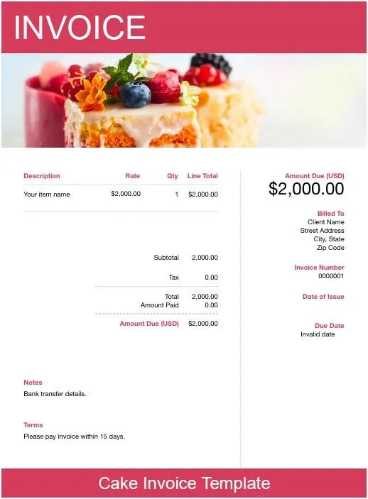 Send professional invoices in minutes with a free template from FreshBooks. Download your free cake invoice template to get started.